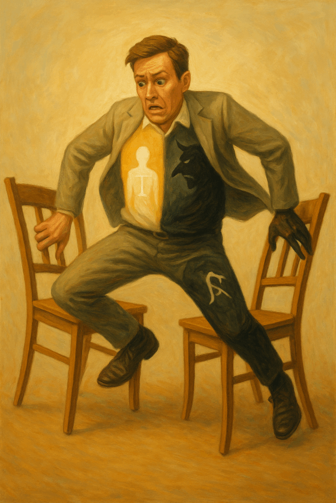 Говоря по-простому, попытка усидеть на двух стульях. Но такая попытка никогда не бывает безвредной. Человеку совестливому, думающему, трудно выступать против собственных убеждений, он не может долго закрывать глаза на собственную двуличность. И тогда он либо прекращает попытки стать как все, и платит ту цену, которую платит – иногда весьма дорогую цену – за то, что остался собой. (Пример – профессор Шай Давидай, выдавленный из Колумбийского университета студентами в клетчатых шарфиках и их наставниками.) Либо убеждает себя, что ложь – это правда, а правда – это ложь. И живет дальше в счастливом убеждении, что можно и рыбку съесть, и в пруд не лезть.