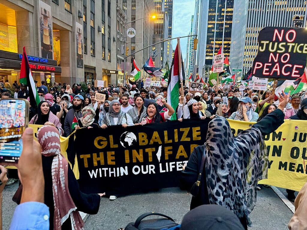 На митинге перед Fox News собрались сотни человек, многие из которых скрывали лица масками или арафатками. Они несли не только флаги Газы, но и откровенно антисемитские плакаты с лозунгами вроде: «From the river to the sea, Palestine will be free» («От реки до моря Палестина будет свободна»), «Globalize intifada», «Long live the intifada» («Да здравствует интифада»), «Fuck Israel» и т.д.