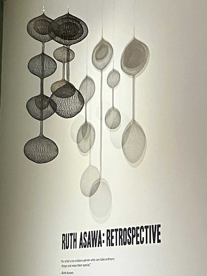 В этом году наш музей организовал именно такую летнюю выставку—ретроспективу работ сан-францисской художницы японского происхождения Ruth Asawa (1926-2013). Ее наполенная постоянным творчеством и незаурядными событиями жизнь, ее многочисленные фантастические проволочные скульптуры, изумительно искусные акварели и филигранные рисунки пером и тушью подробно освещены на выставке Ruth Asawa: Retrospective, где собраны более 300 ее произведений, многие из которых были одолжены у частных лиц. В течение 60-летней карьеры художница щедро дарила свои произведения коллегам и родственникам, друзьям и соседям…