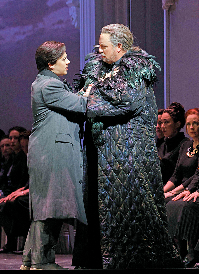 В «Идоменее» же (дирижер Eun Sun Kim, режиссер-постановщик Lindy Hume, дизайнер костюмов Anna Cordingley) партию юного воина и царского сына Идаманта исполняла меццо-сопрано Daniela Mack, одетая то в какое-то невзрачное серое пальто, то в камуфляжные штаны, и, будучи ростом значительно ниже женских персонажей—Электры (Elza van den Heever) и Илии (Ying Fang), явно страдала от визуального диссонанса, даже при том, что зритель привычно верит мужским ролям, исполняемым женщинами с соответствующими композиторскому замыслу высокими голосами. Беженка Илия была почему-то в современном розовом плаще и шарфе фирмы Burberry, а Электра щеголяла в длинном платье из шелка и в накинутом на него суконном пальто, поверх которого в сцене свадьбы ей довольно нелепо навесили пару килограммов золотых украшений…