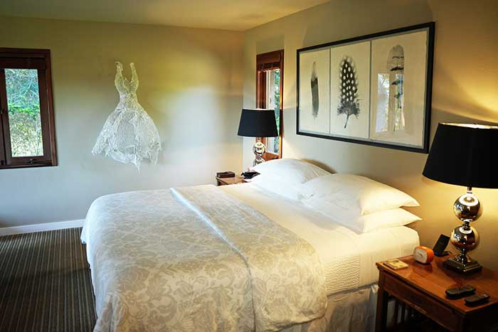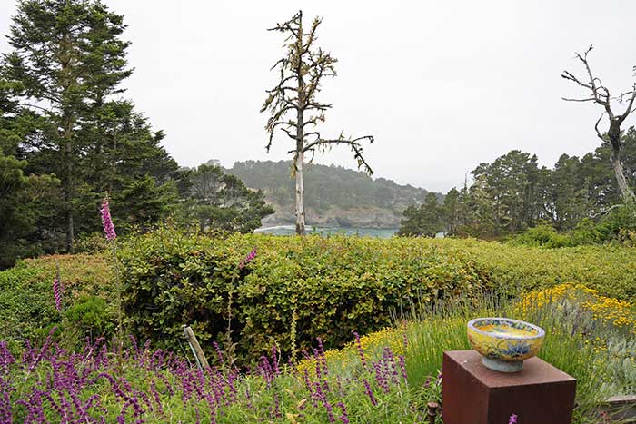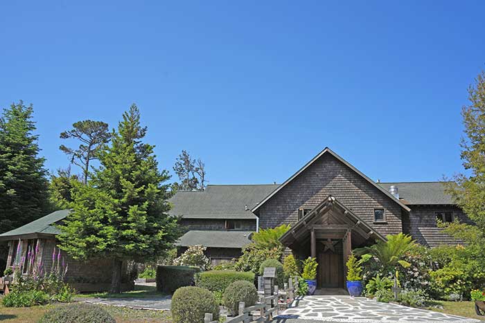 Деревянное здание в стиле Craftsman находится на поросшем соснами холме с видом на голубой залив Smuggler’s Cove. Гостиница окружена садовыми посадками, цветочными клумбами, художественными птичьими кормушками из цветного стекла и журчащими фонтанчиками. Обшитое деревом фойе со стеклянно-стальным камином и высоким сводчатым потолком выходит на просторную террасу, сидя на которой можно наблюдать живописный залив и местную фауну—оленей, диких индюков, соек и дятлов. В фойе, украшенном произведениями местных художников, расставлены столы и стулья, потому что в стоимость номеров включены роскошный завтрак с разнообразным меню и свежей выпечкой и легкий ужин с винами лучших производителей Мендосино, вполне достаточный, чтобы не отправляться вечером на поиски ресторана.
