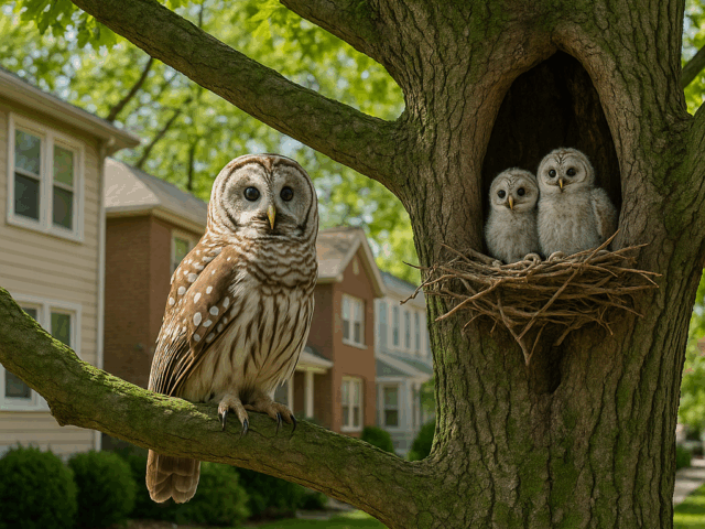 Семья больших рогатых сов поселилась на довольно заметн...